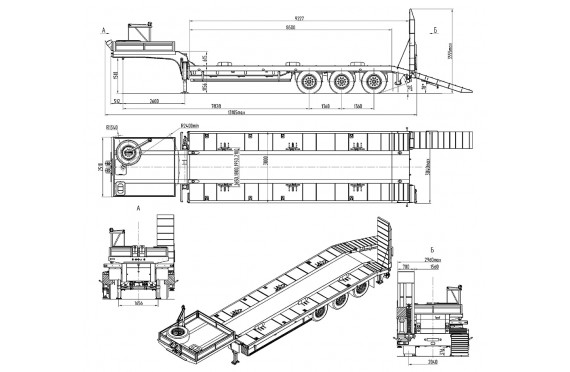 44500 кг, шины 395/85R20 или 445/65R22,5 / 6+1, платформа 12000 (12862 до трапов) x 2530 с уширителями до 3030 мм, ССУ 1510 мм, рессорная или пневматическая подвеска, раздвижные коники, механические трапы с пружиной