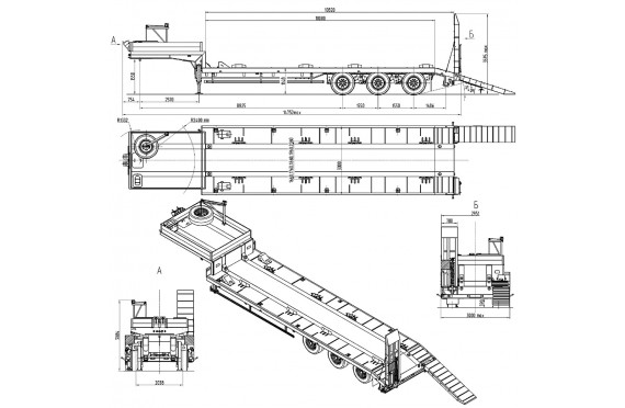 45000 кг, шины 445/65R22,5 или 395/85R20 / 6+1, платформа 10300 (11080 до трапов) x 2500 с уширителями до 3000 мм, приставные алюминиевые трапы, ССУ 1510 мм, рессорная подвеска, съемные стойки 1500 мм, съемные борта