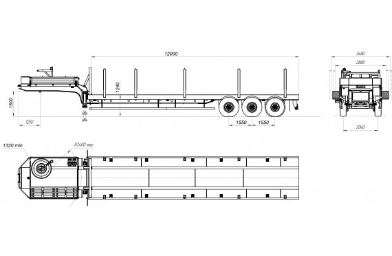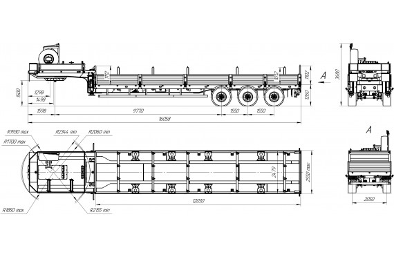 44500 кг, шины 395/85R20 или 445/65R22,5 / 6+1, платформа 12000 (12862 до трапов) x 2530 с уширителями до 3030 мм, ССУ 1510 мм, рессорная или пневматическая подвеска, раздвижные коники, механические трапы с пружиной