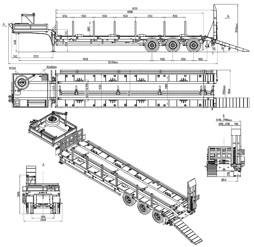 29700 кг, шины 385/65R22,5/6+1, платформа 11000 (11725 до трапов) x 2530 с уширителями до 3030 мм, ССУ 1410-1510 мм, рессорная или пневматическая подвеска, съемные стойки, передний щит